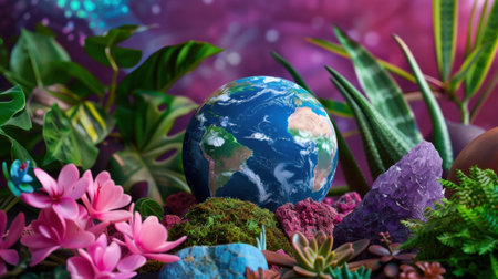 This captivating illustration features a vivid Earth globe amidst a variety of vibrant flora and natural elements, creating a stunning harmony with a colorful cosmic background.