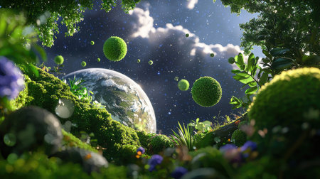 A stunning 3D representation of a planet surrounded by vibrant greenery, showcasing the beauty of nature and environmental harmony amidst lush foliage.