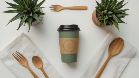 Disposable coffee cup with wooden spoon, fork and plant on white background