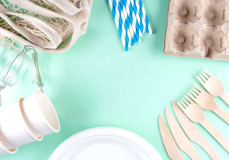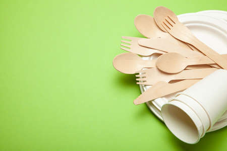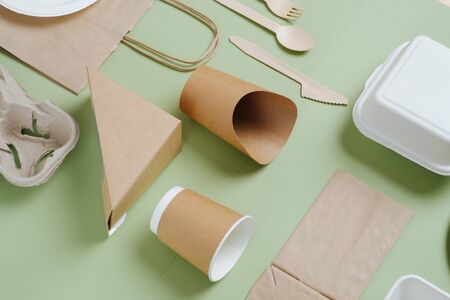 Eco-friendly disposable dishware and bamboo utensils over green background. Paper and cornstarch cases, cups, packets and dishes. Top view.