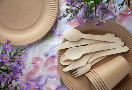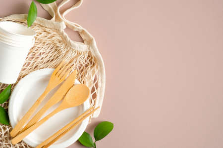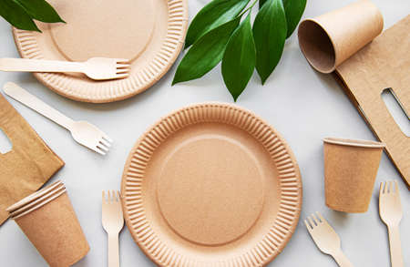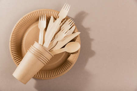 disposable paper and wood biodegradable tableware on a beige background, eco friendly lifestyle concept