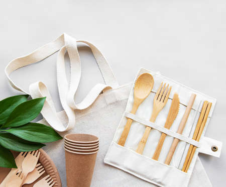 Eco-friendly bamboo cutlery, paper cups and plate. Flat lay, top view. Sustainable lifestyle. Zero waste, plastic free concept