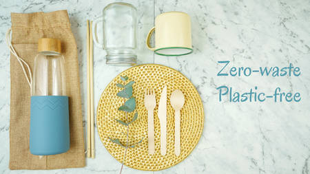 Zero-waste, plastic-free tableware flatlay overhead with bamboo and natural fibers to replace single use plastic products.