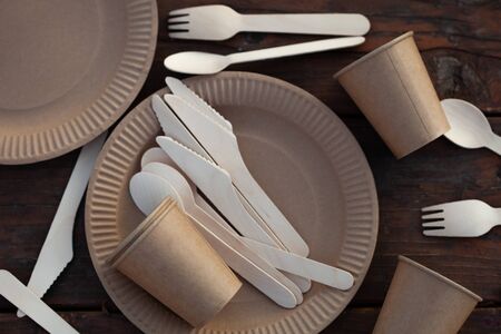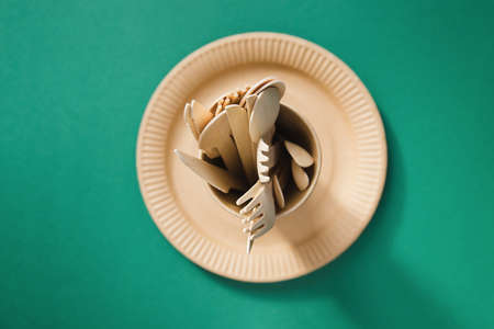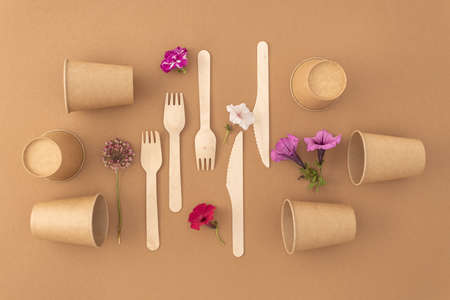Zero waste, plastic free concept. Disposable paper cups with wooden forks and knives. Eco sustainable living