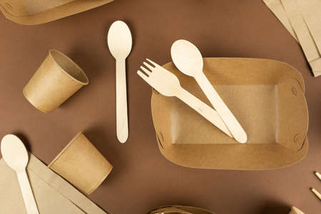 A set of disposable tableware and wood cutlery on brown background. Fast food containers. Eco-conservation concept. Flat lay.