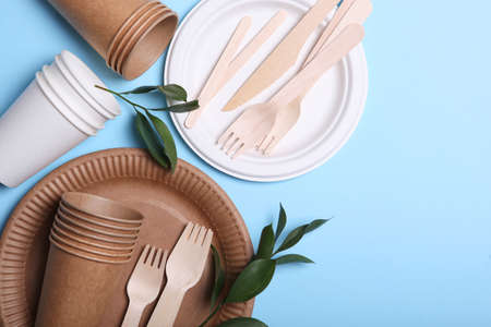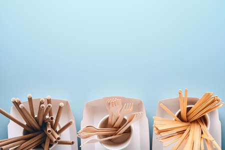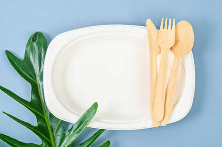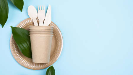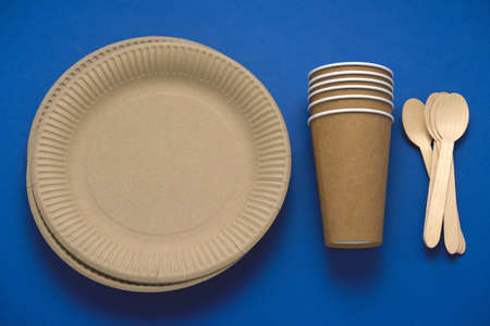 disposable paper and wood biodegradable tableware on a blue background, eco friendly lifestyle concept
