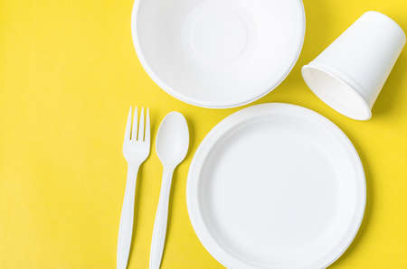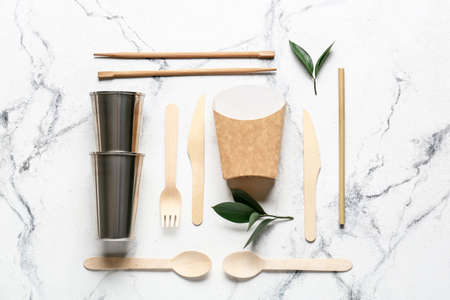 eco friendly disposable dishes made paper on white marble background. Draped spoons, fork, knives, plate with paper cups. recycling concept