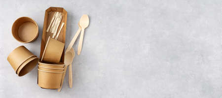 Sustainable food packaging concept. Paper tableware and utensils - paper cups, containers, plates and wooden bamboo cutlery over gray concrete background