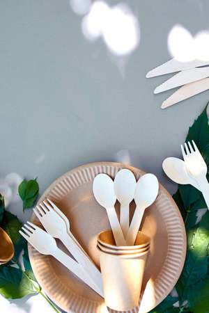 Flat lay of eco craft paper and wooden tableware, summer sunlight, Zero waste, plastic-free and eco-friendly living, paper cups, dishes,plates and wooden cutleryrecycling or eco-friendly concept.