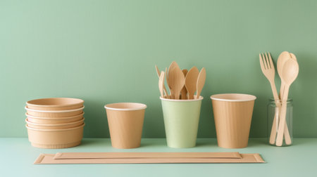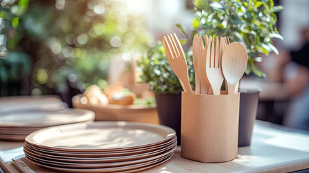 Close-up of biodegradable food packaging alongside eco-friendly paper plates and utensils, highlighting the importance of sustainability in dining. Ample room for messaging. -