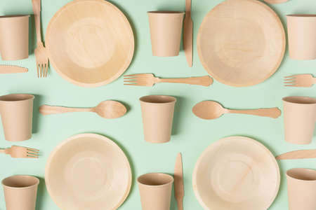 Set of disposable dishes and utensils. Wooden forks and knives, paper cups and plates against beige green background. Biodegradable eco-friendly tableware and recycling concept. Front view.
