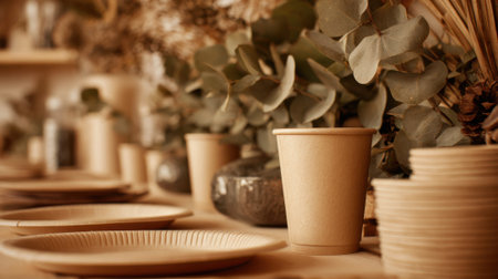 Medium shot of biodegradable party plates and cups arranged on a table showcasing ecofriendly event planning with natureinspired decor elements.