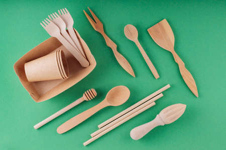 Eco-friendly disposable utensils made of bamboo wood and paper on a green background. Draped spoons, fork, knives, bamboo bowls with paper cups