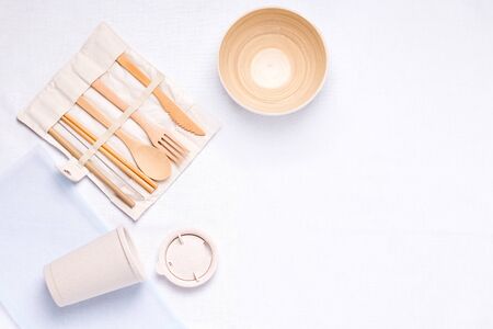 Eco friendly disposable dishes made of bamboo wood and paper on white wooden background. Zero waste, eco friendly, plastic free background.