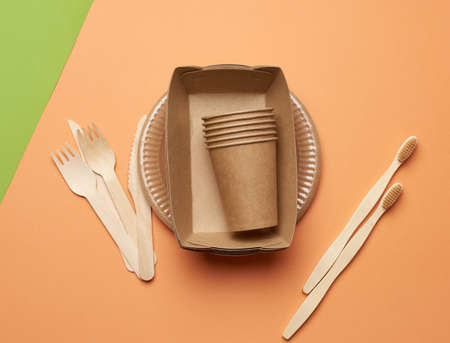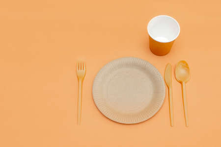 paper plates and cups from brown craft paper and wooden forks and knive on a orange background. Plastic rejection concept, zero waste