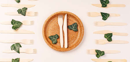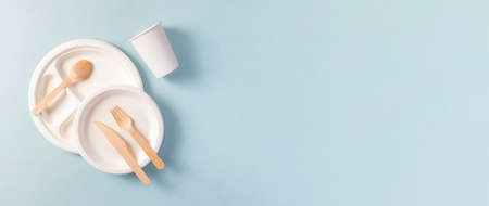 Plastic-free disposable tableware, horizontal banner format with copy space. Paper plate, food containers, glass, wooden spoon, fork, knife