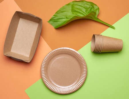 Zero waste, environmentally friendly, disposable, cardboard, paper tableware. View from the top.