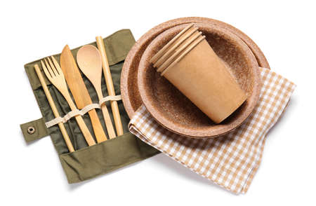 set of empty reusable disposable eco-friendly plates, cups, utensils on light white colored table background. top view. Biodegradable craft dishes. Recycling concept. Close-up.