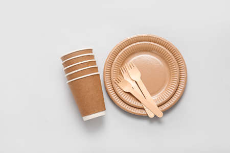 Eco friendly disposable cardboard tableware. Plates, cups and tubes are arranged on a light background. top view.