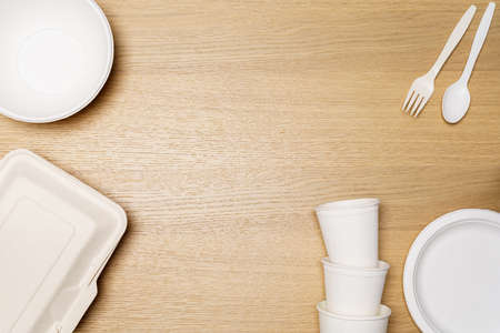 Paper utensils and tableware, wooden cutlery set, paper cups, plates, bags, pulp cup holders and food containers over light brown background with copy space. Top view. Sustainable food packaging concept