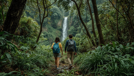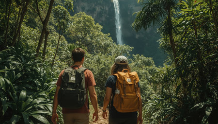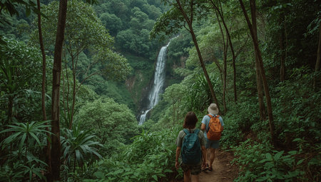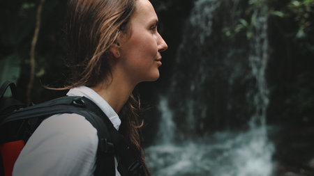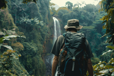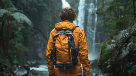 A traveler with a backpack admiring at a majestic waterfall in a lush tropical forest setting