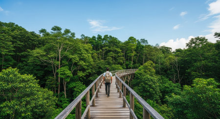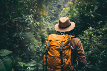 A hiker journeying through a lush tropical rainforest, surrounded by vibrant green plants, showcasing the beauty and serenity of nature's wilderness.