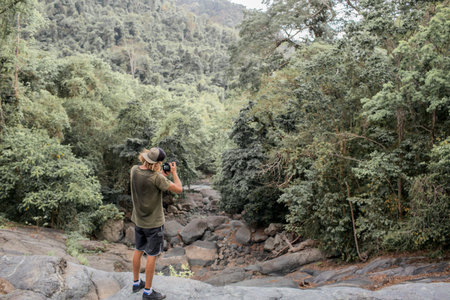 Photographer exploring tropical rainforest near a river and a wooden house