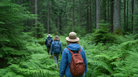 A serene scene depicting a group of hikers walking along a scenic forest trail. The lush greenery and towering trees create a peaceful atmosphere, perfect for adventure and exploration.