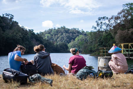Shan state, Myanmar - January 5 2020: A tourist group rests on lunch break while on a hike from Kalaw to Inle Lake