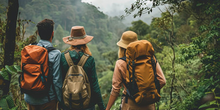 Group of Friends Trekking Through Lush Jungle, Embracing Adventure and Scenic Mountain Views
