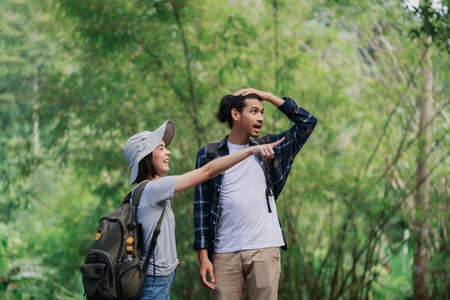 Young couple with backpacks hiking in the jungle. Man and woman hiking in the forest.