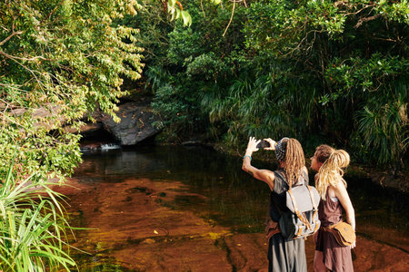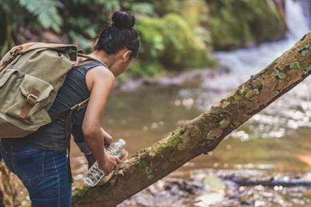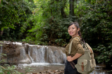 Female hikers take pictures of themselves with beautiful waterfalls. Relax after hiking