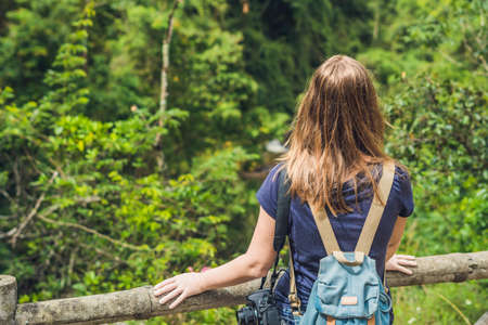 Female traveller with backpack relax and enjoy the natural scenery on mountain landscape. Trekking in tropical rain forest.