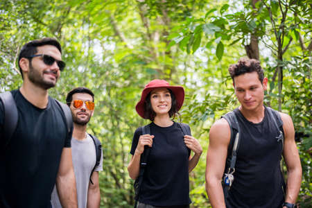 Group of traveler friends walking together at nature,Enjoying backpacking concept