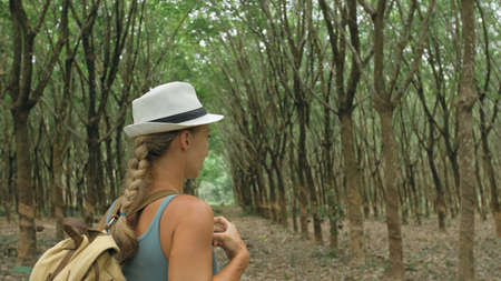 The traveler walks between trees plantation agriculture of asia