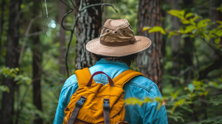 A man wearing a brown jacket and a yellow backpack is walking through a forest. He is wearing a brown hat and has a camera in his hand