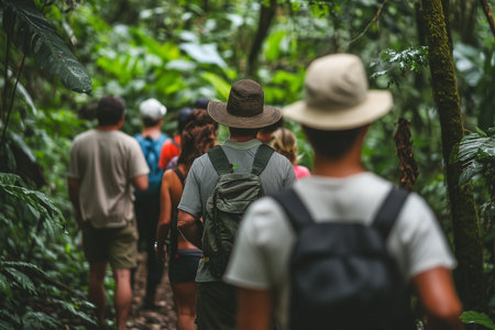 A lively group of adventurers trekking through a vibrant rainforest that is filled with lush greenery all around. Generative AI
