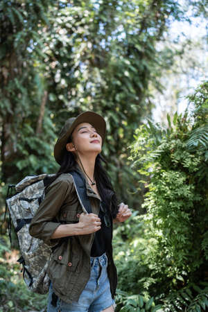 Asian young beautiful female backpacker traveling alone in forest wild. Attractive girl traveler look around and explore while walk in nature wood with happiness and fun during holiday vacation trip.