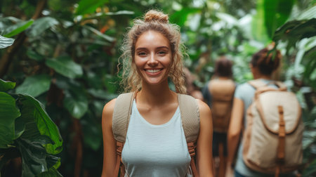 A young woman smiles brightly while hiking through a vibrant jungle with friends nearby.