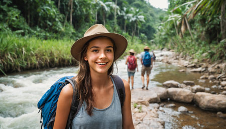 young hiker girl smiling in jungle stream setting with fellow trekkers in background