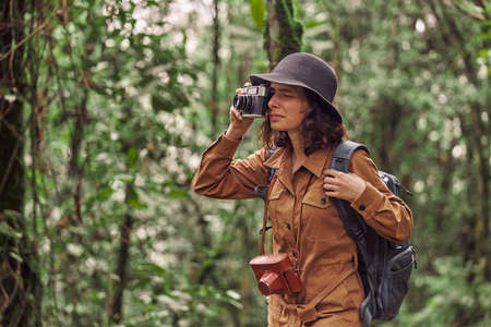 Young traveler woman with backpack and hat standing with camera travel photo of photographer making pictures in hipster style
