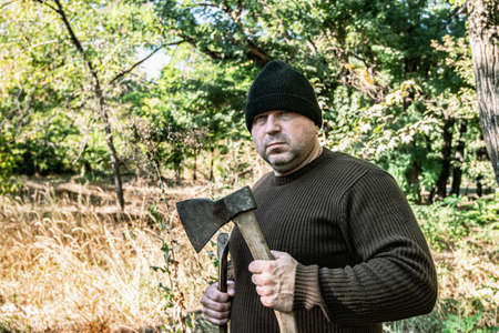 Lumberjack in the forest. Man with ax. Serious lumberjack. Bearded man with ax in hands. Bearded lumberjack. Lumberjack worker.