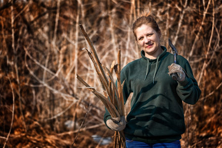 The person in a willow grove cut lots of branches. Preparation of material for weaving from a rod or construction of a fence, a wattle fence.