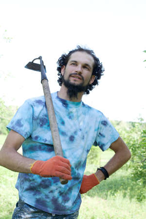 confident man with axe. caucasian man hold ax. brutal man showing power on sky background