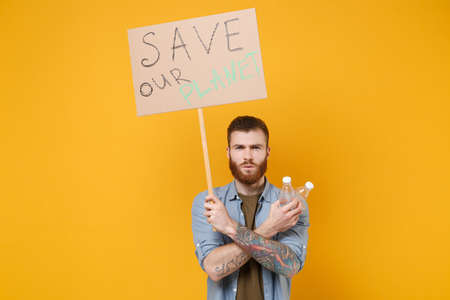 Displeased young protesting man hold protest sign broadsheet placard on stick, plastic bottle isolated on yellow background. Stop nature garbage ecology environment protection concept. Save planet.