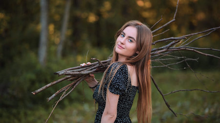 young beautiful woman volunteer activist in the forest with a poster save the forest