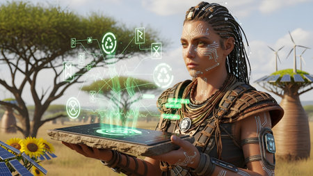 A woman with complex face paint and tribal attire uses a holographic display in a savanna with...