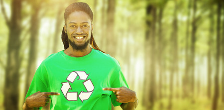 A male volunteer with a garbage bag cleans up the environment in the forest.