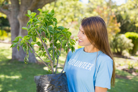 Young female volunteer plants a forest, holding an oak tree seedling in her hands