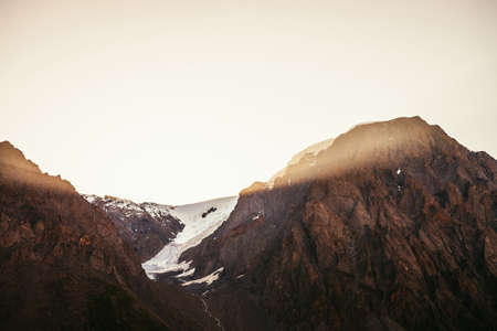 Golden rays of rising sun on high snowy mountain top with glacier. Beautiful morning landscape with gold sunlight in big mountains. Minimalist colorful scenery with golden sunbeams. Sunny minimalism.